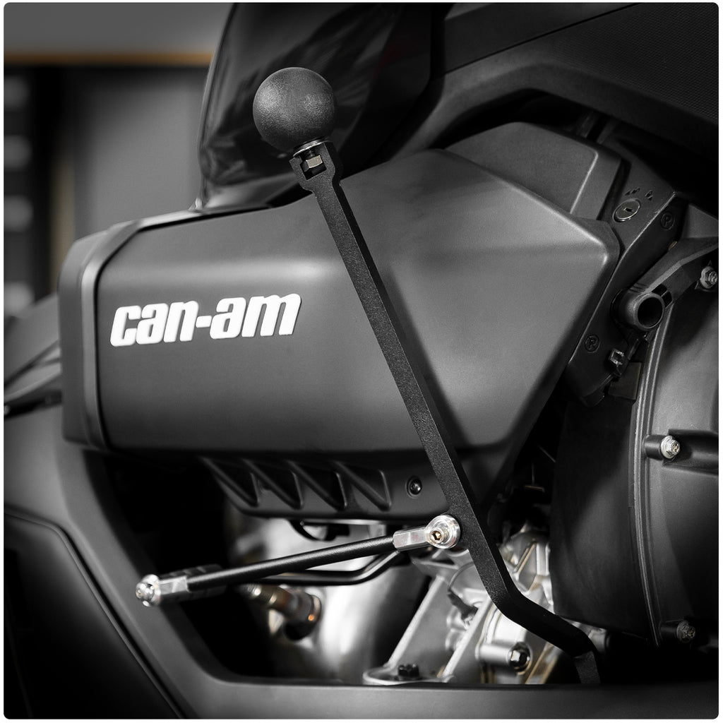 The Gen 2 jockey shifter bar is made from solid laser cut steel, and is precision bent to hug the contours of the Can-Am Ryker body panels, while allowing for compatibility with the hypnotic concepts left side cup holder. It features a fully revised shift linkage system that utilizes ball joints on both ends of the shift linkage, allowing for super smooth shifting. At the base of the shifter bar, we have a revised collar bracket design that allows you flexibility to adjust the outward pitch of the shifter bar to maximize leg clearance, so that you can find the position that best fits you.