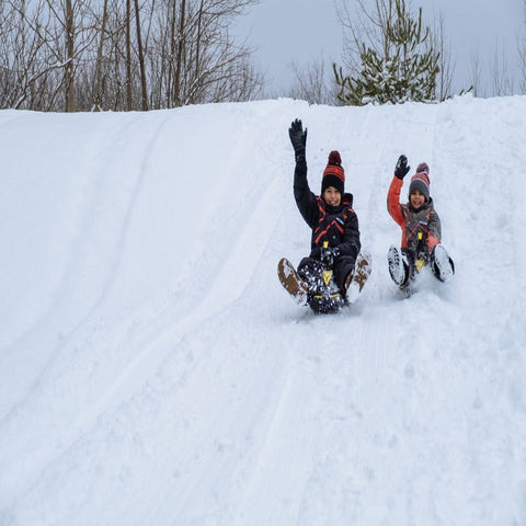 The Ski-Doo Mini Snow Sled for single rider lets you ride rodeo-style with upraised feet while holding the handle to steer. The textured seat offers extra grip to keep you riding on without sliding off.